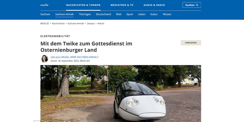 mdr.de, 18.09.2022Der Pfarrer der Gemeinde Osternienburger Land ist in seinem Pfarrbereich mit einem besonderenn Gefährt unterwegs. Wenn also am Sonntagmorgen die Kirchenglocken läuten, steht vor der Kirche in Elsnigk ein dreirädriges Elektromobil. Denn der Pfarrer fährt nicht mit dem Auto, sondern mit seinem TWIKE zum Gottesdienst. Eine umweltfreundliche Alternative, findet der Kirchenmann, der jede WocheWeiterlesen „mdr.de: Mit dem TWIKE zum Gottesdienst im Osternienburger Land“