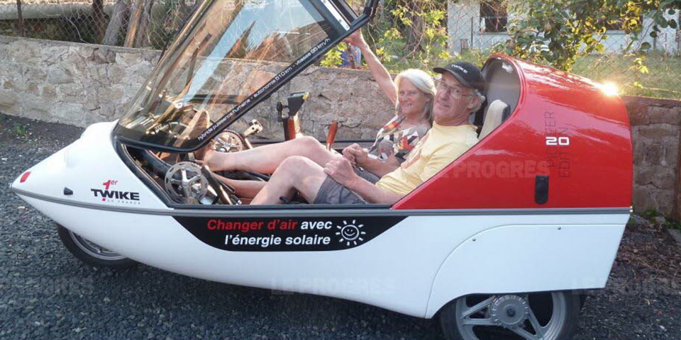 Amis de Willy Guieau, élu ponot au sein de la communauté d’agglomération du Puy-en-Velay, qui les a hébergés pour l’occasion, Wim et Evelien ont déjà parcouru 6 000 kilomètres à bord de leur TWIKE. Catégorisé comme tricycle, l’appareil a tout pour plaire : il permet de faire monter à son bord deux personnes de taille adulte et leurs bagages tant que le poids total n’excède pas les 500 kilos. Ses pneus étroits lui permettent de se frayer un chemin sur toutes les routes, qu’il neige ou qu’il vente. Produit par l’entreprise allemande Finemobil Rosenthal (qui en construit un par semaine), le TWIKE coûte la coquette somme de 35 000 euros, ce prix comprenant l’achat des batteries nécessaires pour tenir les 250 kilomètres d’autonomie de l’appareil.
