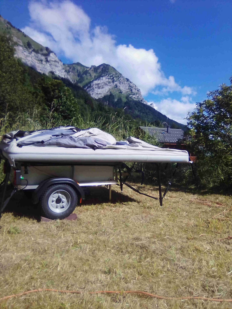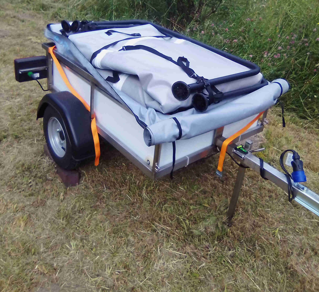 Wir campen gerne, aber ein Dachzelt auf dem TWIKE 5 ist nicht möglich. Auch ein Anhänger mit Dachzelt obendrauf war zu viel. Ein leichtes Dachzelt wiegt mindestens 40 kg und mit ungebremstem Anhänger und Campingzubehör kommt man mit Gepäck locker auf 120 kg. Außerdem kann man nicht in einem Dachzelt stehen, also haben wir unsere Suche fortgesetzt.