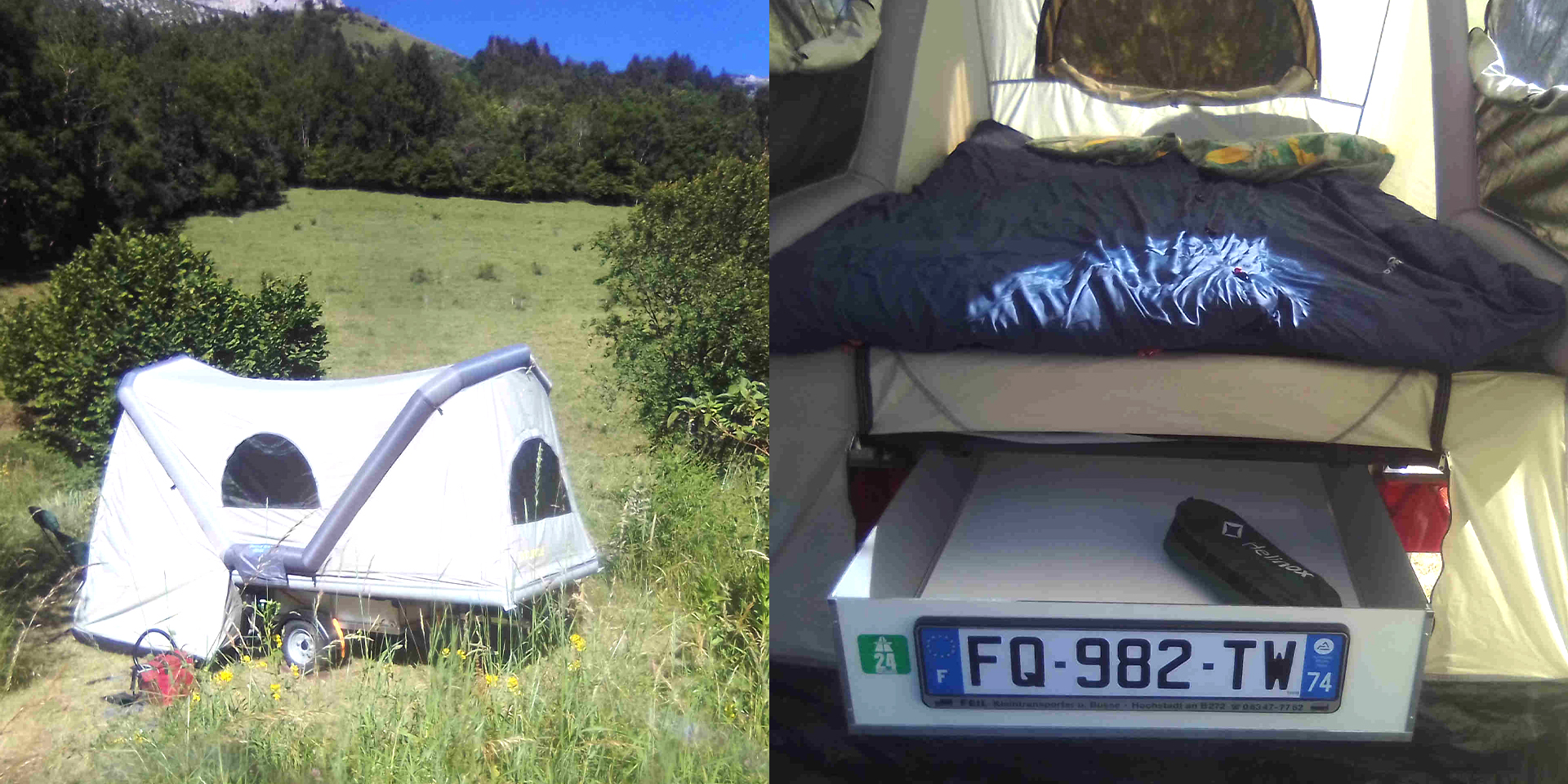 ATV-Teile.de ist Hersteller von kleinen leichten Anhängern. Mit Interesse und Ideenreichtum wurde für uns ein kleiner, stabiler Pkw-Anhänger maßgeschneidert. Es enthält eine geräumige Schublade für Matratze, Schlafsack oder Bettdecke, Kochset, Tisch usw. Das Ganze mit TÜV-Prüfung und Zulassung. Ein eigenes Kennzeichen ist nicht erforderlich, da ein solcher leichter Anhänger in Frankreich immer das gleiche Kennzeichen wie das Zugfahrzeug haben muss.